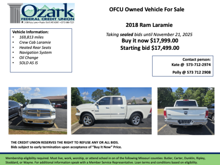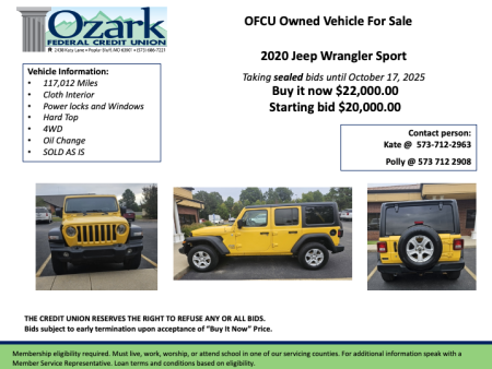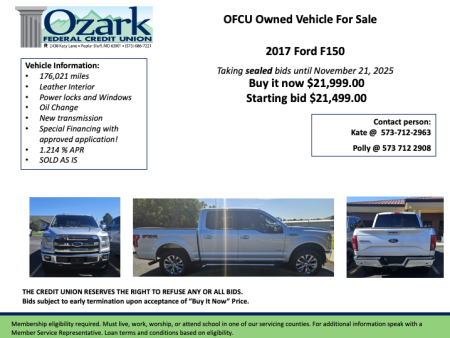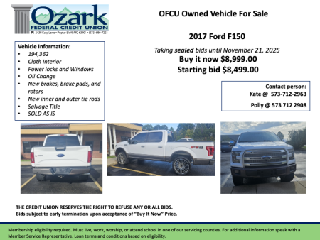 For inquiries regarding any of our Ozark Federal Credit Union-owned vehicles, please contact Kate Pogue, our Member Solutions Specialists in the Loan Department.